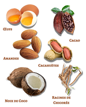 Fibres de racines de Chicorée, Blancs d’œufs en poudre pasteurisés (20%), Cacahuètes grillées 18% (purée, entière), Poudre de Protéines d'amandes 13%, Poudre de Cacao 4,5%, Huile vierge de Noix de Coco 1,1%, arôme Naturel Noisette Chocolat, Sel.