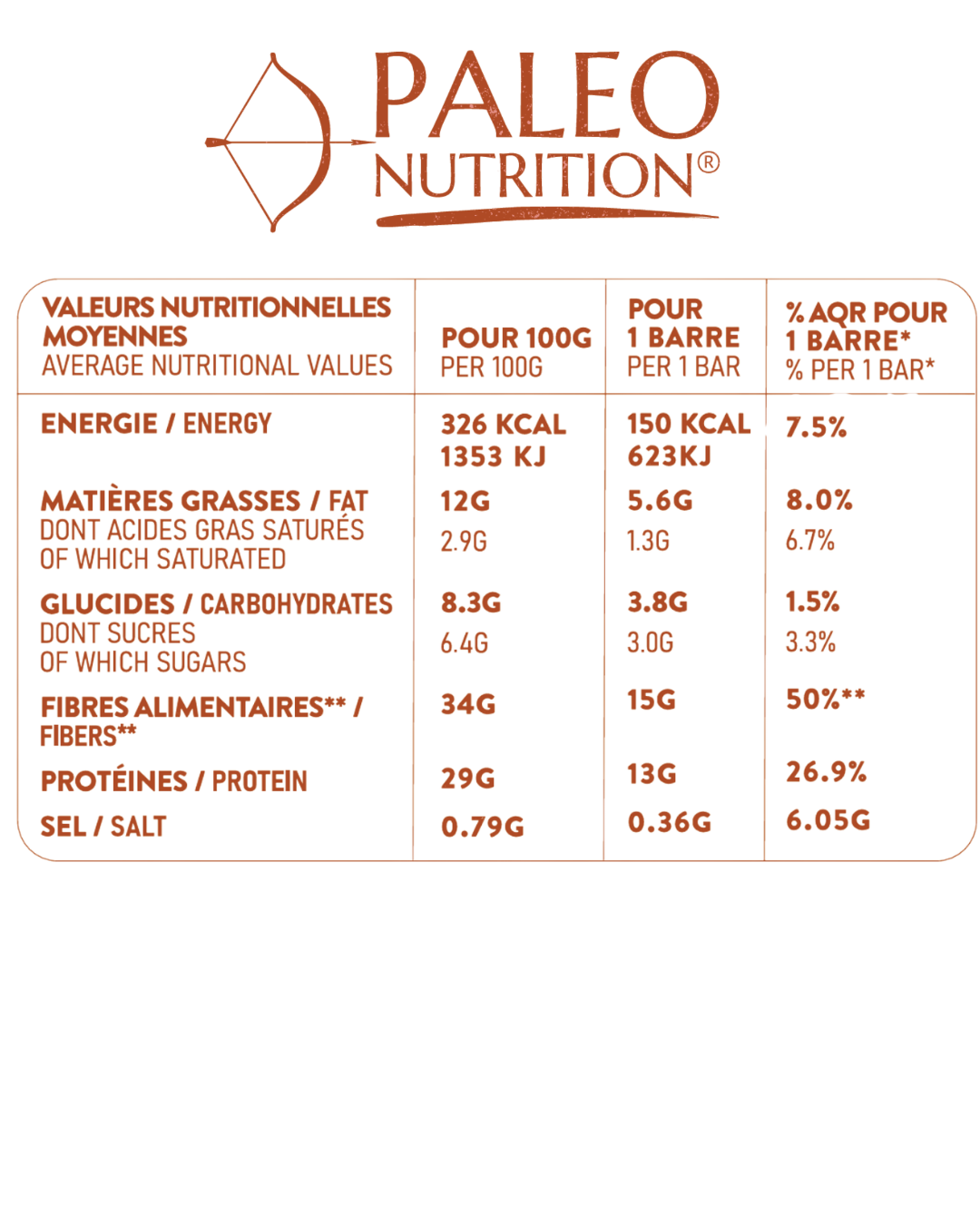Nos barres répondent aux standards des régimesPALEO, Cétogène (keto diet) et Végétarien.